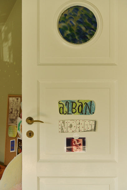 This is Alban and Noam's room: Handwritten name plates show their names on the door.