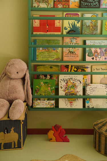 A the large book shelf is placed in the corner, keeping all of Alban and Noam's books within reach. This corner is one of the boys' favourite places to play, especially Noam enjoys to play here.