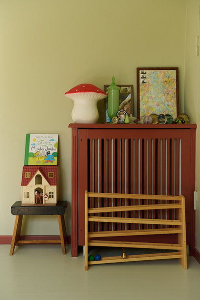 A large red mushroom lamp sits on the radiator cover, that is also used as a shelf. In front, a large wooden ball track with a soft bell that rings every time a ball passes and reaches the end.