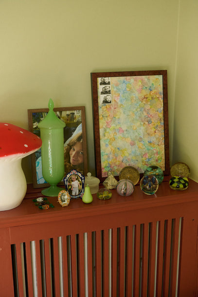 Annika frequently travels to Italy for her glassware production. Each trip, she returns with a glass paperweight, now making up a small, beautiful collection. To the left, a warm and cosy large red mushroom lamp.