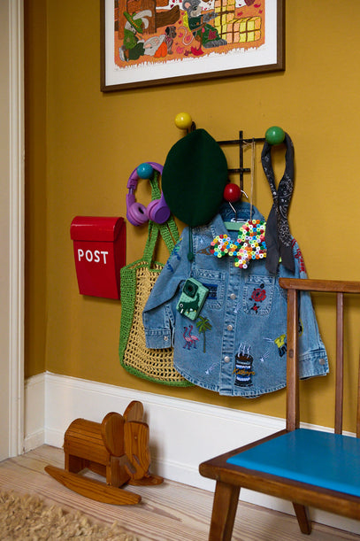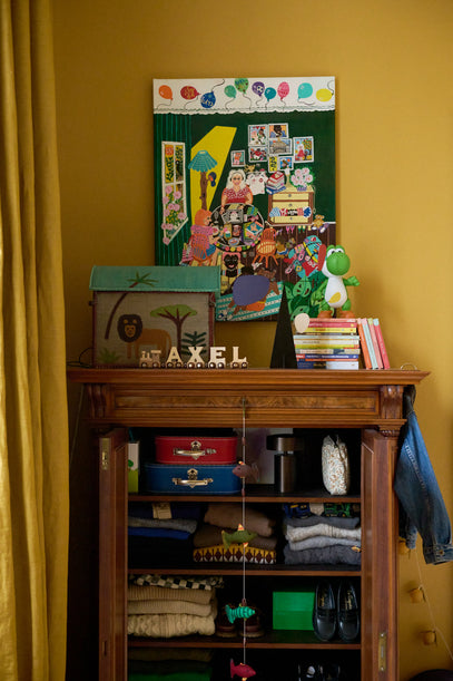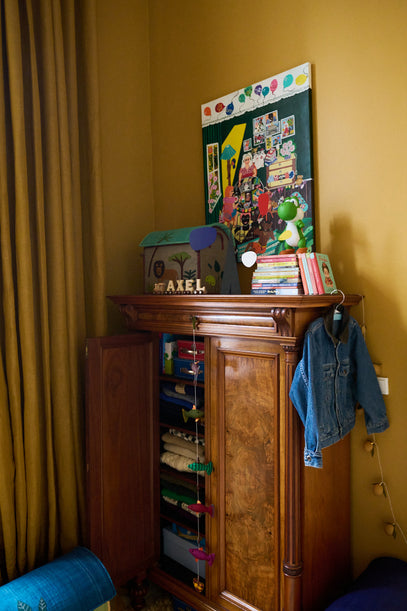 A cupboard was found second hand and restored by Axel's granddad. Now it is used for clothes, shoes and toys. On top sits a pile of books, an amazing jeans jacket and a small raffia basket. Find a similar one here.