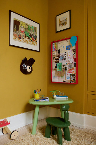 Beautiful colour combinations in this corner of the room with the yellow wall paint, a dark brown papier-mâché mask, the green table and a red pinboard.