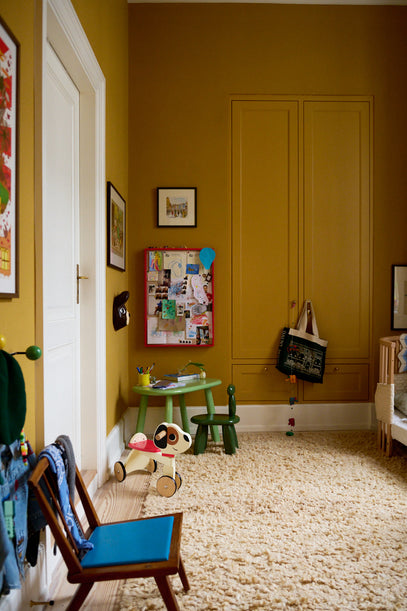 3-year-old Axel's room is an amazing, colourful and warm room put together by a careful selection of rich colours, vintage finds, a large soft rug and personal details.
