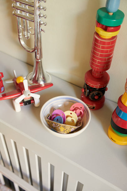 A cute bunny bowl is used to store colourful pacifiers and a handmade pacifier clip. Next to it, some of Barbara's toys, most found on flea markets.