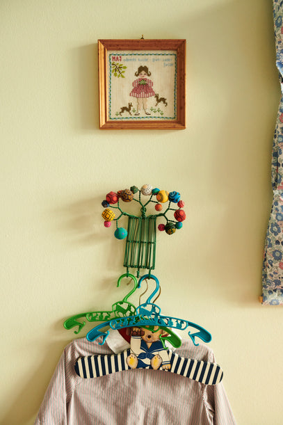 Colourful hangers match the green wall hook from Zimbabwe perfectly. The hook was a gift from Barbara's grandmother, and a special one since Barbara's mother grew up in Zimbabwe.