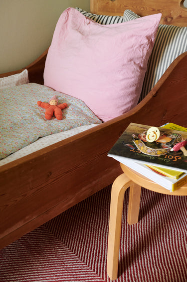 A stool is placed by the bed, holding a few books that are read at bedtime including Solægget by Elsa Beskow, first published in 1932.