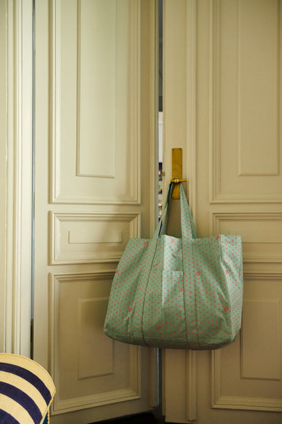 The beautiful double door with exquisite details including carved panels and the old brass handle. On this handle hangs a large Bonton tote which is used for outings during weekends.