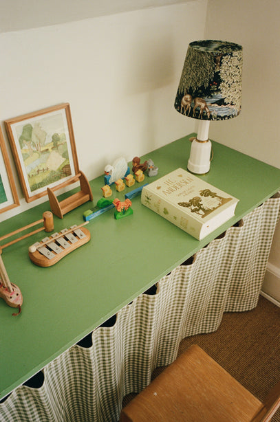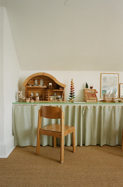 A custom made desk is the perfect place for a visual display of some of Eva's toys, as well as a place for her to play. A homemade curtain allows for storage underneath.