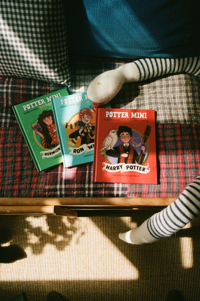 The new Harry Potter series 'Potter Mini', bathed in sunlight. This series is a collection of mini guides to Harry Potter, Ron Weasley and Hermione for younger readers.