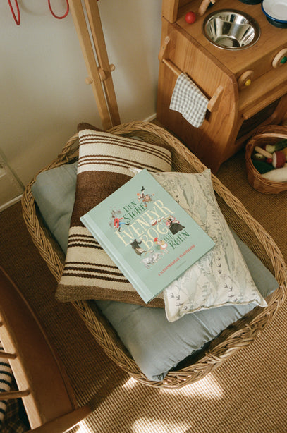 A basket full of soft pillows, blankets and Gyldendal's 'Den store Eventyrbog'.