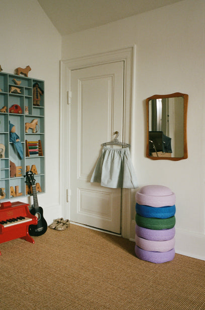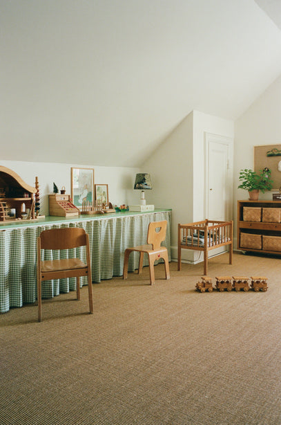This is a room designed for imaginative, open play, and outside distractions are kept at a minimum. In here, wooden toys dominate, alongside vintage furniture and a wall-to-wall rug, adding softness to the room – and keeping noise down from toys hitting the wooden floor underneath.