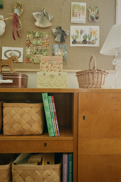 The shelf works as storage for toys, books and Eva's things, including little baskets, suitcases and other keepsakes.