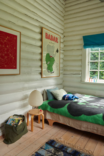 Above the bed hangs a framed Babar a 50 Ans poster, and on the bed lies a Knitted Whale. The little stool is vintage and the light is from Vitra, designed by Japanese designer Isamu Noguchi.