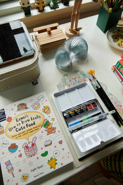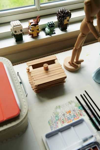 Desk view: A practical water colour set from Creativ Company that is easy to bring along on day trips sits next to a little box Gilbert made years ago from wooden sticks, LEGO figures in window sill, and a small suitcase where Gilbert stores some of his art supplies.