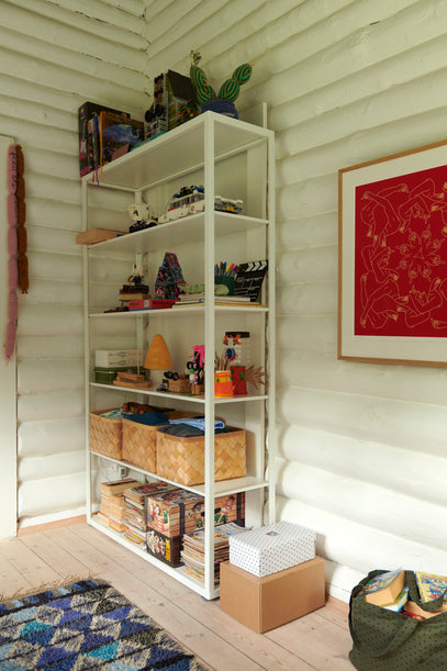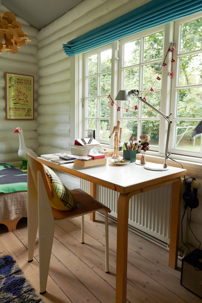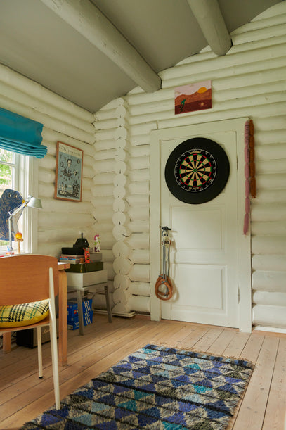 Gilbert's room is a corner room with plenty of natural light and views to the garden. The white wooden logs make the colours in here pop, but somehow the look is still surprisingly calm, and the space has a cosy, Scandinavian feel.
