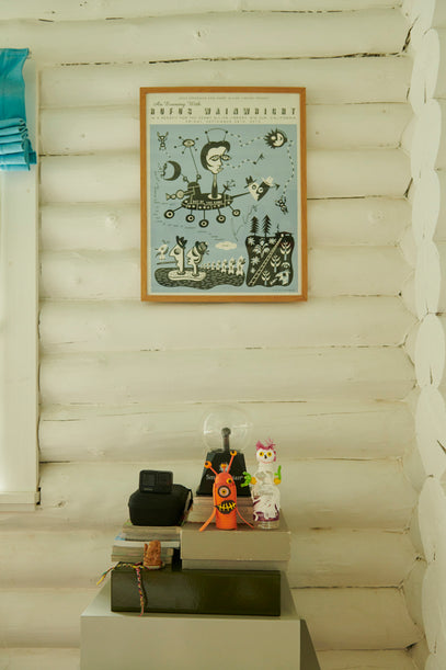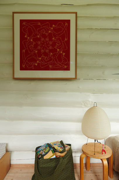 A bright red silk print from Ai Weiwei, that was given to Gilbert on his 12th birthday, has been framed and now hangs between the shelf and the bed.
