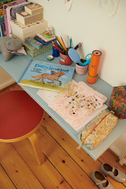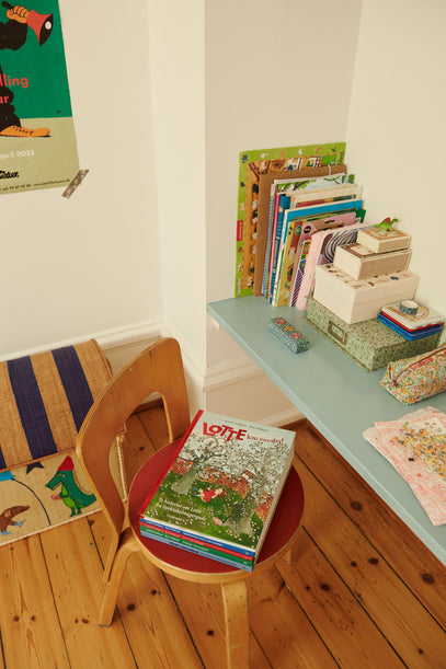 Hilma loves to spend time by her desk playing, painting and colouring. This is also where she keeps all of her colouring books and stickers. Find similar arts and crafts here. A pile of Astrid Lindgren books from Gyldendal are placed on the chair; one of them Lotte kan nemlig is a current favourite.
