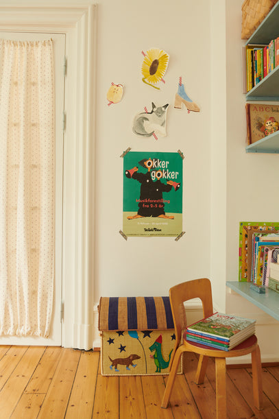 Beautiful drawings by Hilma's dad, artist Viktor Henderson, hang above the Okker Gokker poster. Underneath sits a large raffia basket. A pile of Astrid Lindgren books from Gyldendal are placed on the chair.