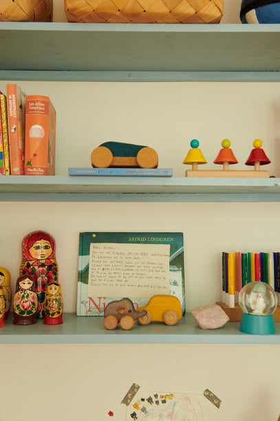 Babushkas, wooden toys, 24 markers in a wooden box and other personal belongings make for a lovely display on the shelves above the desk.