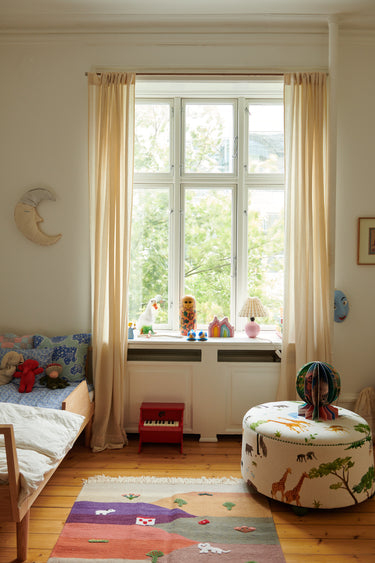 Seen here: The Happy Valley rug, Our World, a Charlie Chair, a knitted whale, a soft doll in mint green, and a duck lamp in the window sill.