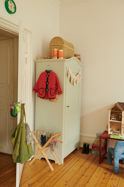 The vintage wooden cabinet was found in this lovely mint colour. Next to it is a drying rack with pegs and baby hangers in use to hang Hilma's dolls' clothes.