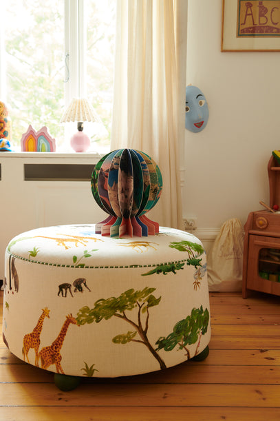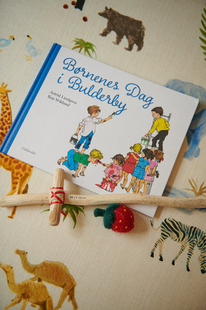 Børnenes Dag i Bulderby from Gyldendal is a classic book in a beautiful new edition. The book lies on a pouf made by Tea and A Slice with fabric from Svenskt Tenn brought home from Stockholm. Next to the book; a sword made by Hilma.