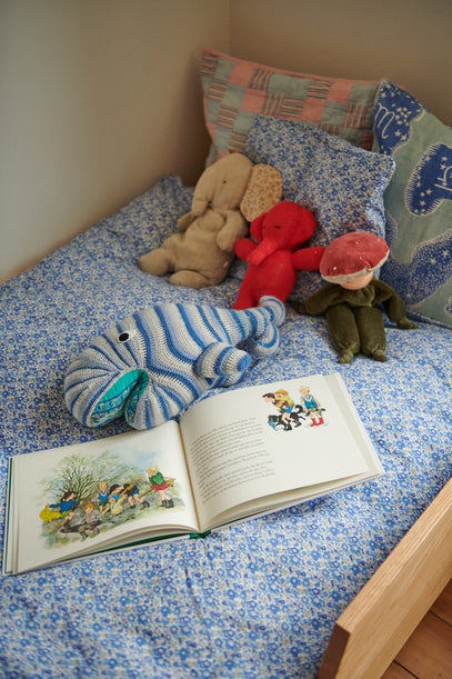 A blue Liberty duvet cover is a colourful contrast to the natural wooden bed frame. On the duvet lies 'Forår i Bulderby' by Astrid Lindgren and next to it a large knitted whale.