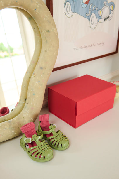 Cute little sandals and berry socks and Isabelle is ready for summer. Next to the sandals is a Hako Storage Box in colour cherry red.