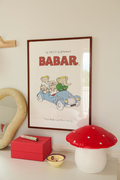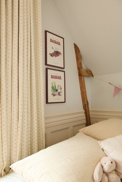 Two Babar posters have been framed and hung on the wall by one end of the bed. Explore our Babar selection here.
