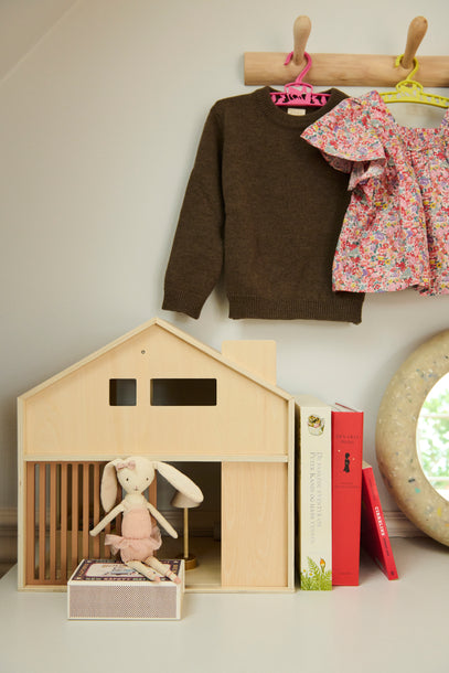 A few toys and books are placed on the cabinet – including Peter the Rabbit and Cirkeline elsker ord. Above the cabinet hangs a dark brown Studio Mini cashmere sweater on a pink junior hanger.