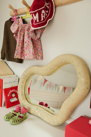 The newly launched Marine Mirror from ecoBirdy sits on the cabinet, next to a cherry red storage box, a kaleidoscope and a large red mushroom lamp.