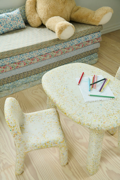 All furniture from ecoBirdy is made from old toys and plastic waste. First, everything is sorted by colour, then shredded into smaller pieces and finally put into molds to create the popular Charlie Chair and Luisa Table. Here, the set is seen in colour vanilla.