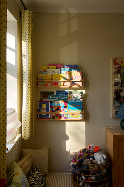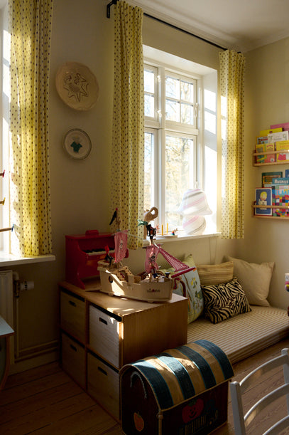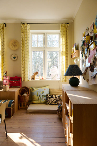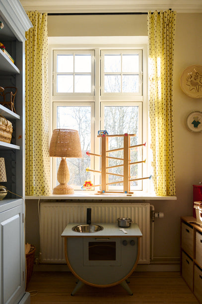A raffia lamp, a wooden car track and a play kitchen – and yellow curtains that Sofie has sewn herself. A great example of the variety of textiles, fabrics and colours that are mixed so effortlessly in here.