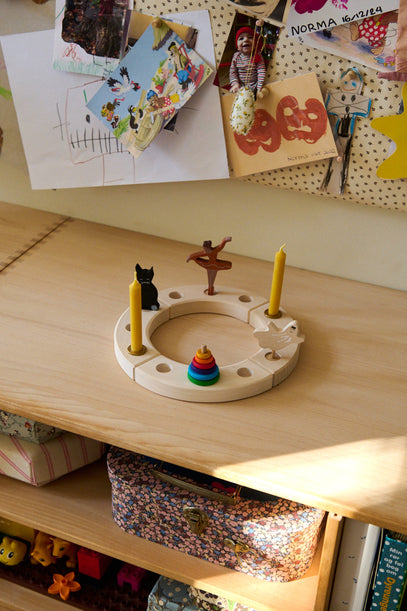 A celebration ring from Grimm's is placed on the wooden cabinet, featuring some wonderful figures including the black cat, spooky and beeswax candles.