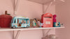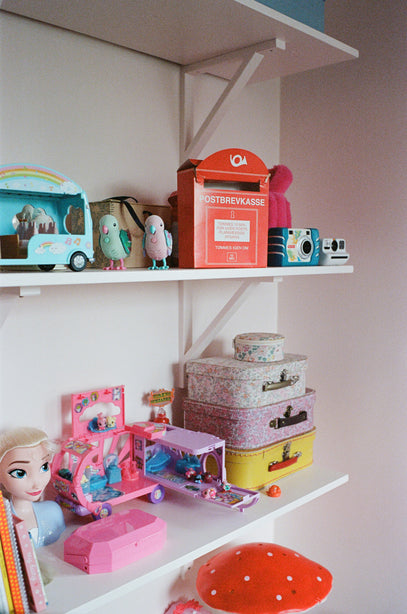 Some of Olga's favourite toys, including Sylvanian Families, have a place on these shelves. The red Mushroom Lamp sits on the lower shelf, and is in use every evening at bed time.