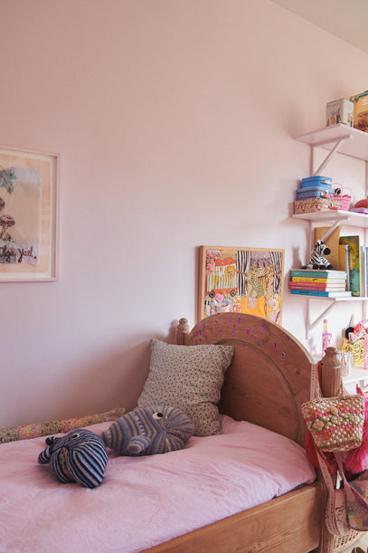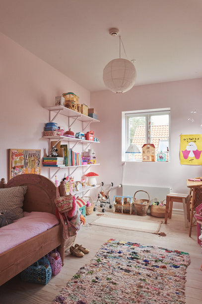The shelves have been painted in the same colour as the room, which creates a sense of calm. Books, toys, little suitcases and a Mushroom Night Light have a place here. Rugs add a soft touch to the room.