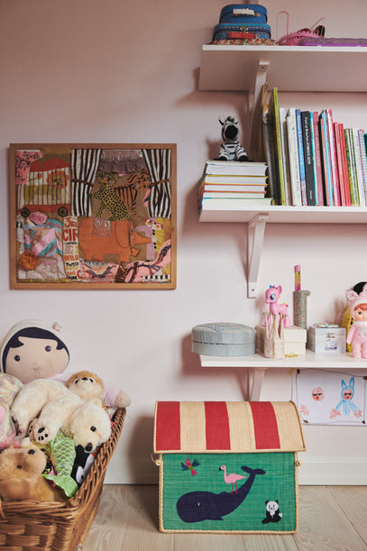 On the wall hangs a textile art piece from Helle Høgsbro Krag; below an open rattan basket with all of Olga's favourite teddybears. A Raffia Basket is placed underneath the shelves.