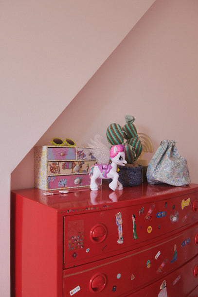 Olga has added her own touch to the red drawer by decorating it with stickers. On top of the drawer is a knitted Cactus by Creme de la Crema ala Edgar, a treasure box, one more unicorn and a Liberty pouch.