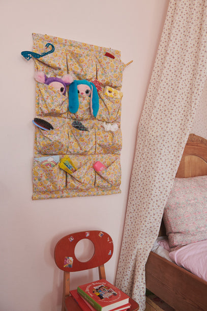 A handmade wall-storage piece, made by Olga's mom from Liberty fabrics, adds a soft touch to the room. Here, Olga keeps a Hanger, smaller teddies and toys, and a Mason Pearson brush.