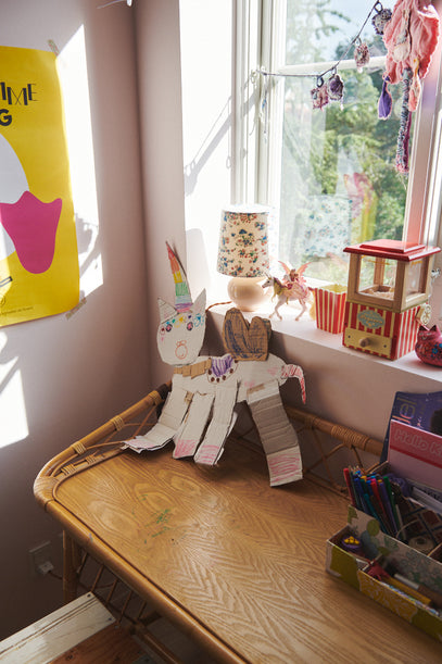 In the window: An old garland from Helle Høgsbro Krag (see the Flag Garland to create a similar look), Olga's popcorn machine, and a cute, little lamp. On the desk sits a unicorn made by Olga.