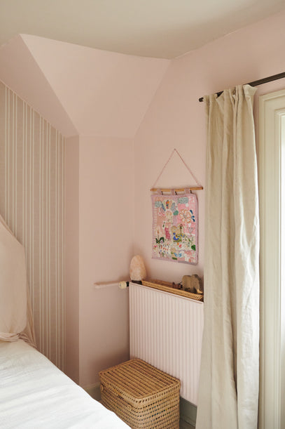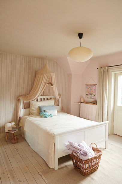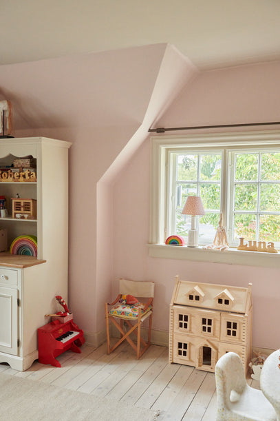 Born 16 months apart, sisters Roberta, 4, and Luna, 3, share this beautiful and inspiring room. Their shared space is painted in soft pink tones, creating a warm and welcoming atmosphere that feels both calm and playful.
