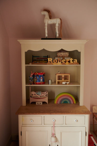 A vintage cupboard, originally bought by Roberta and Luna's dad, is now used for storage in the kids' room. The open shelves allow for some of the girls' favourite toys to be on display, including the classic drum and little wooden animals.