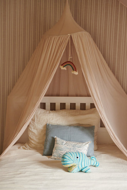 A pink canopy frames the bed, on which a cute knitted whale lies. Behind the whale is a Liberty pillow.