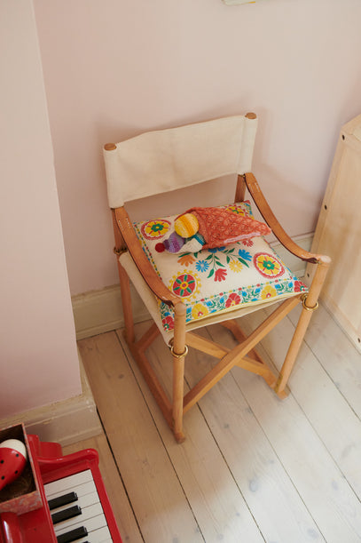An ice cream rattle on top of a colourful pillow; both placed in a beautiful Mogens Koch folding chair.