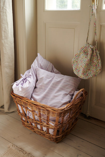 Clean and crisp bedding in a beutiful rattan basket. On the door hangs a Liberty Pouch.