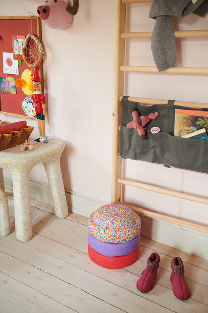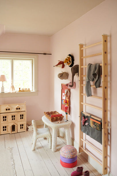 A vanilla-coloured chair-and-table set is placed next to the Endeløs Wall Bar, hanging on the wall by the door. A grey cashmere sweater from Studio Mini hangs on the wall bar, while three colourful Stapelsteins and a pair of indoor shoes in pink are placed on the floor.