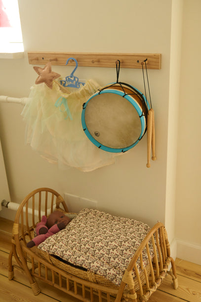 A blue drum hangs next to a skirt for dress-up. Underneath, a cute rattan doll bed where a teddy and a Pimpel doll in berry sleep.