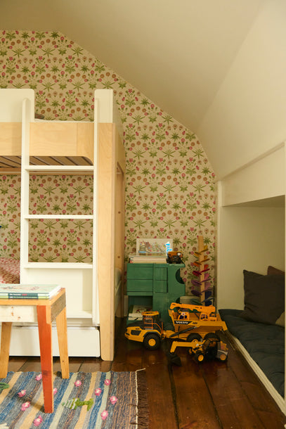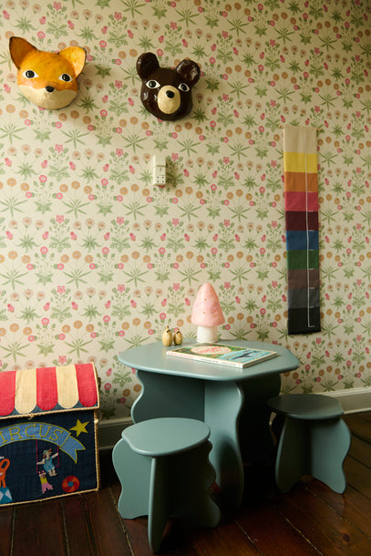 The green table and chair set and the pink mushroom lamp match the beautiful wallpaper from William Morris.