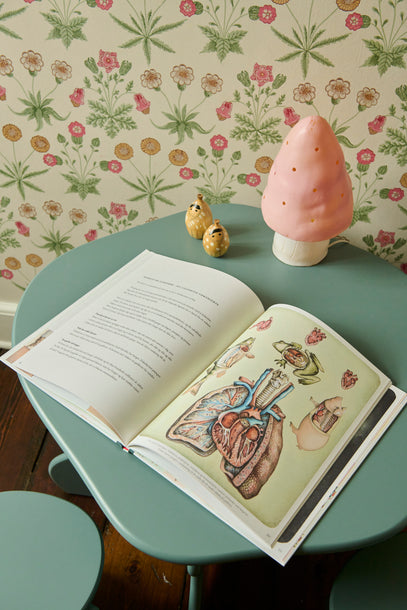 A peek inside the educational book 'Din Fantastiske Krop', with beautiful illustrations by Kamilla Wichmann. The pink mushroom lamp adds a soft light during day and at night time.