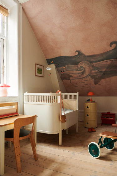 Ruth's crib is placed in the corner, which is made cosy and dreamlike with the use of wallpaper and the Cherry Birds Mobile. On the wall hangs a little Babar poster (find a similar one here) that has been framed.